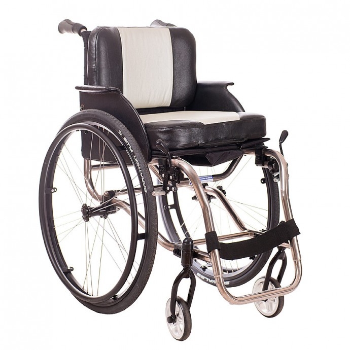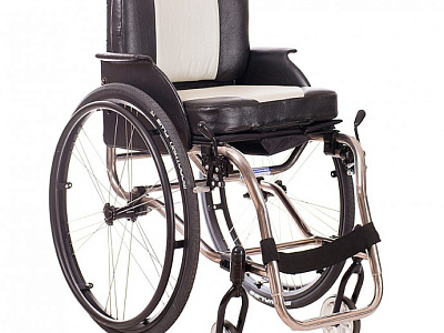 Жесткая рама изготовлена из прочного титанового сплава. Спинка, сиденье и подлокотники сделаны из натуральной кожи. Коляска предназначена для активной ежедневной эксплуатации, независимо от погодных условий, преодоления различных препятствий. Задние колеса пневматические, передние литые. Коляска рассчитана на нагрузку до 100 кг.