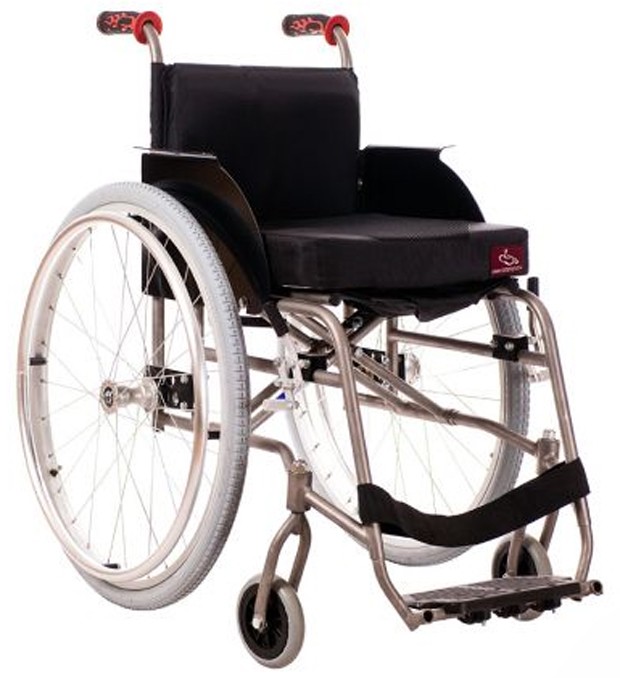 Рама, крестовина рамы, подножки, спинка, ручки и вилки передних колес сделаны из титанового сплава повышенной прочности. Рама складная, задние колеса быстросъемные. Коляску можно помещать в багажник без посторонней помощи. Вес изделия составляет 10-14 кг. Задние колеса пневматические, передние литые. Коляска отлично подходит для быстрой самостоятельной езды, в том числе по различным препятствиям. Рассчитана на нагрузку до 100 кг.